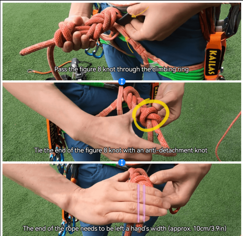 Ensure the figure-8 knot passes through the climbing loop, with an overhand safety knot tied at the tail, leaving a palm-width (approximately 10 cm) tail.